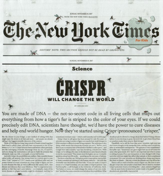 Il numero del New York Times for Kids del novembre 2017. E a seguire il video di Wired con CRISPR spiegato a cinque livelli di complessità (per bambini, ragazzi, studenti di college, laureati ed esperti). Enjoy!