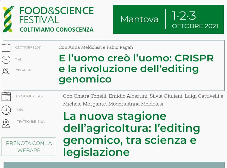 Venti minuti dedicati alla frontiera delle biotecnologie verdi, dalla A di apomissia alla V di vite, passando per il pane a basso contenuto di glutine. Lisa Iotti ci porta a visitare i laboratori italiani che usano CRISPR nelle piante, con un paio di incursioni in centri europei all’avanguardia. Appaiono in ordine: Roberto Defez, Luigi Cattivelli, Gianfranco Diretto, Alberto Acquadro, Francisco Barro, Dirk Inze, Giovanni Battista Tornielli, Mario Pezzotti, Sara Zenoni, Vittoria Brambilla, Anna Meldolesi, Emidio Albertini. Il video completo è qui, su RaiPlay.